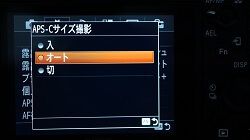 この設定がオートになっている場合、APS-Cサイズ対応レンズを装着してもカメラ側が認識してAPS-Cのイメージセンサーとおなじ働きを行うのだ。