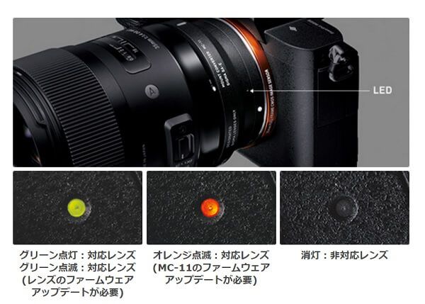 装着したレンズがSIGMA MC-11に対応するレンズかどうか?ファームウェアのアップデートが必要かどうかなどをランプで示してくれるようだ。